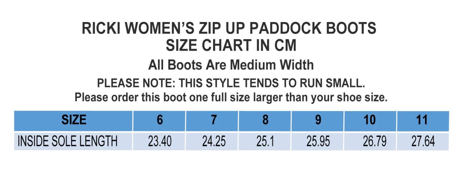 With a timeless leather-like look, this water-repellent boot is versatile and stylish. The front-zip design provides a secure, snug fit, and the elastic side inserts are comfortable around the ankle with room to expand. The Ricki Women’s Zip-Up Paddock Boot features a built-in spur rest, and anti-skid rubber soles with nylon stitching to prevent breakage. Perfect for jumping, shows, or just out and about. A great boot for schooling sessions and casual rides!Â