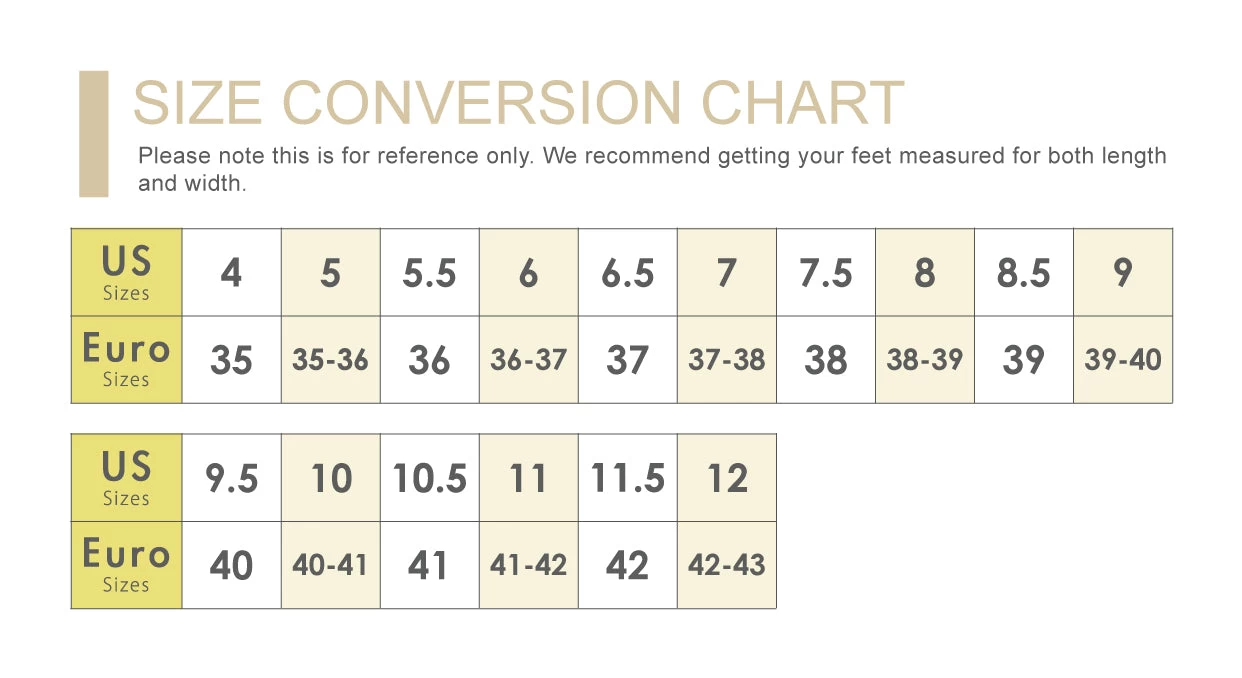 NOTE: Sizes shown are Euro sizes. Please refer to the conversion chart for US sizing.
