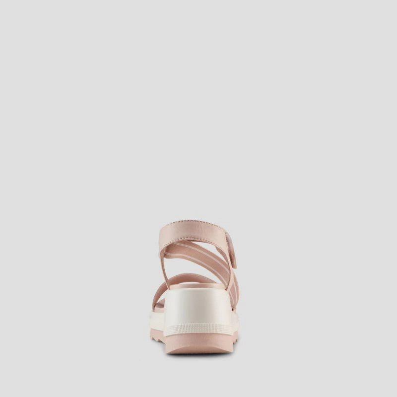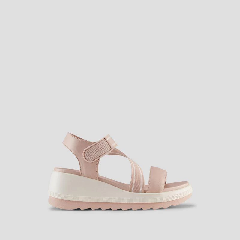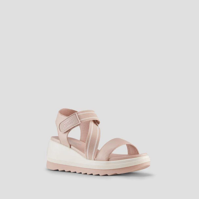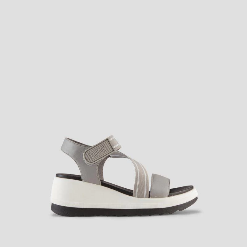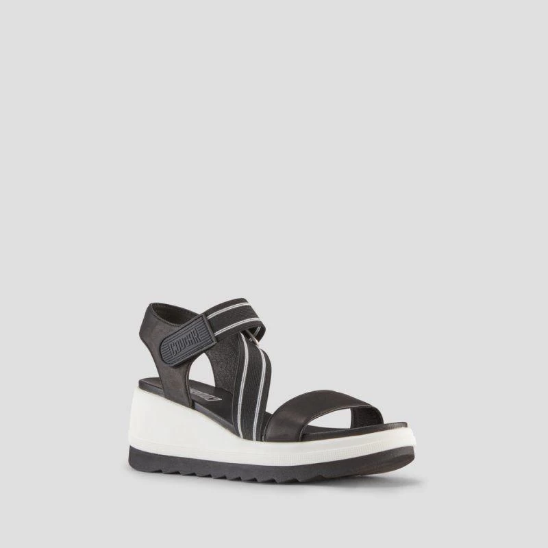 Luxury open-toe sandal made with soft nappa leather. Fabric elastic straps. 2.5 inch wedge heel. Hook and loop closure. Rounded toe with moulded comfort footbed. Lightweight EVA cushion outsole.