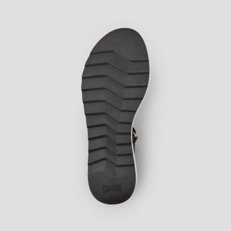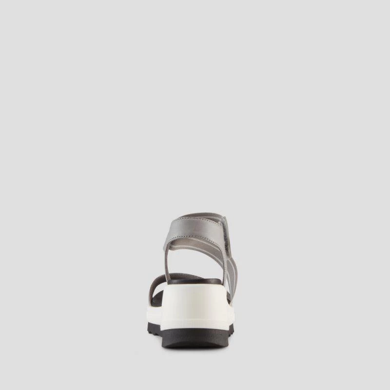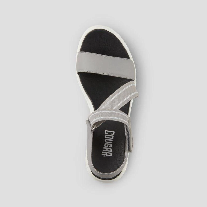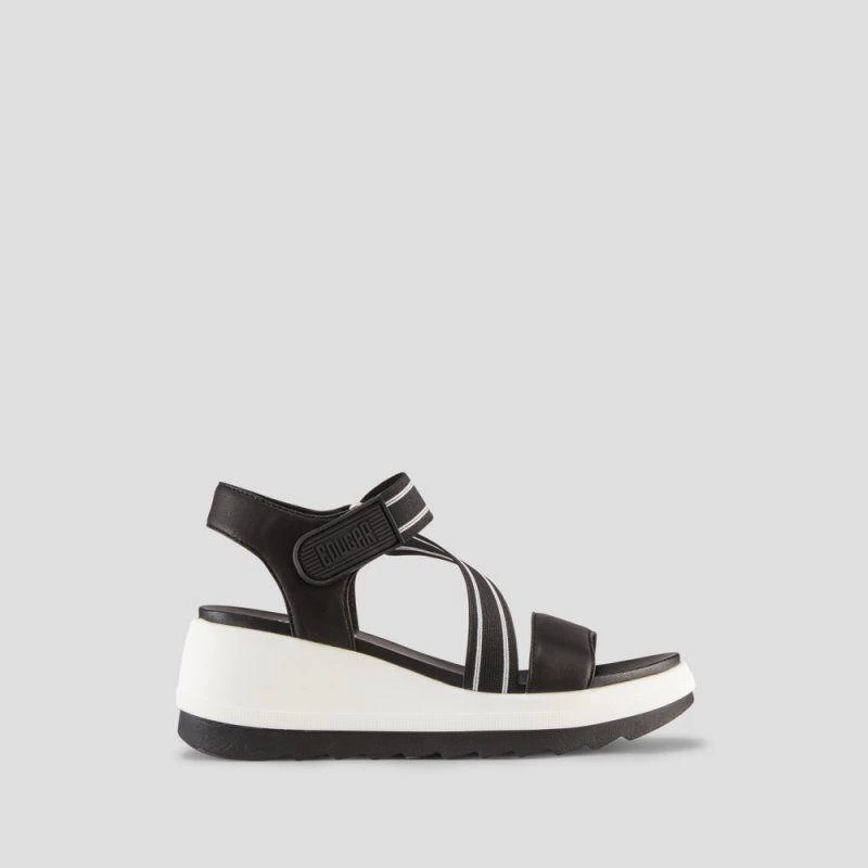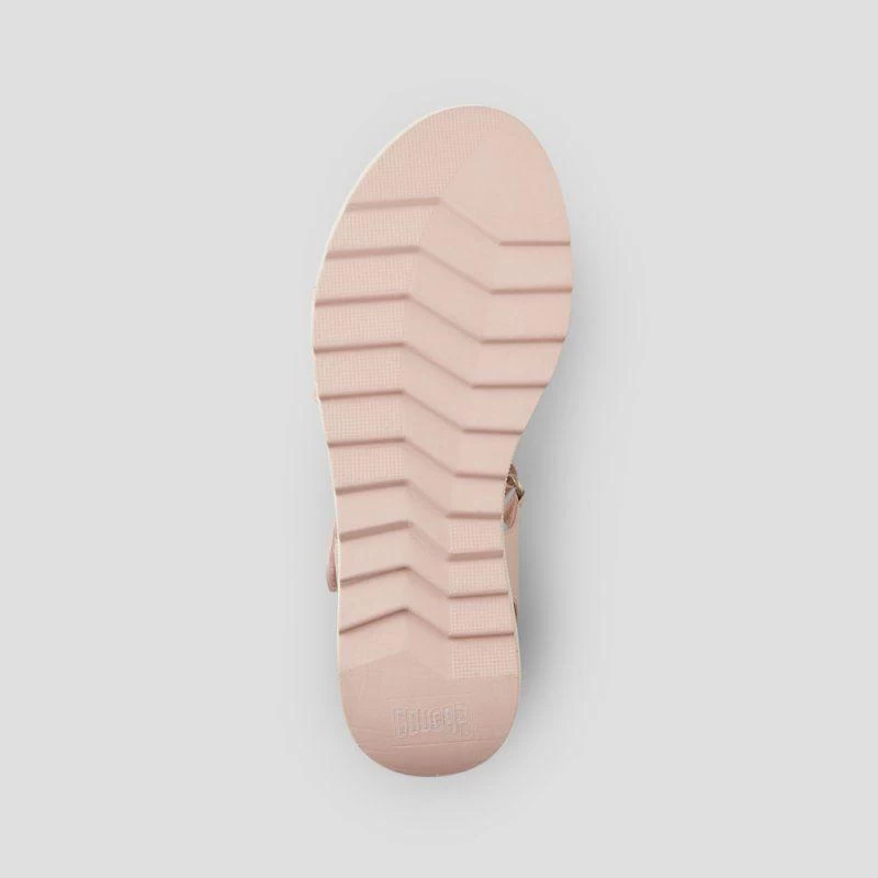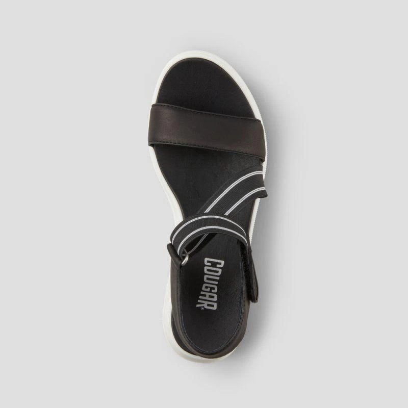 Luxury open-toe sandal made with soft nappa leather. Fabric elastic straps. 2.5 inch wedge heel. Hook and loop closure. Rounded toe with moulded comfort footbed. Lightweight EVA cushion outsole.