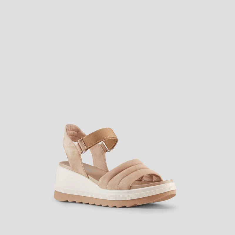 Luxury open-toe sandal made with soft kid suede. Padded straps. 2.5 inch wedge heel. Hook and loop closure. Rounded toe with moulded comfort footbed. Lightweight EVA cushion outsole.