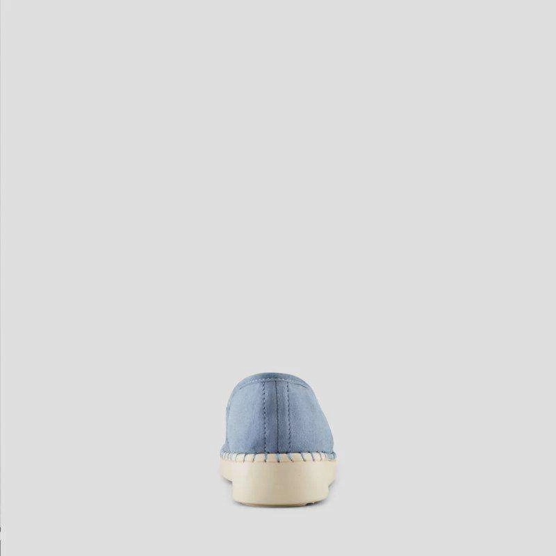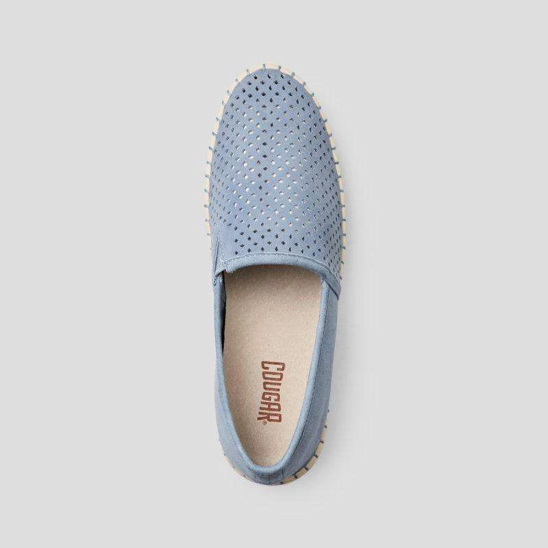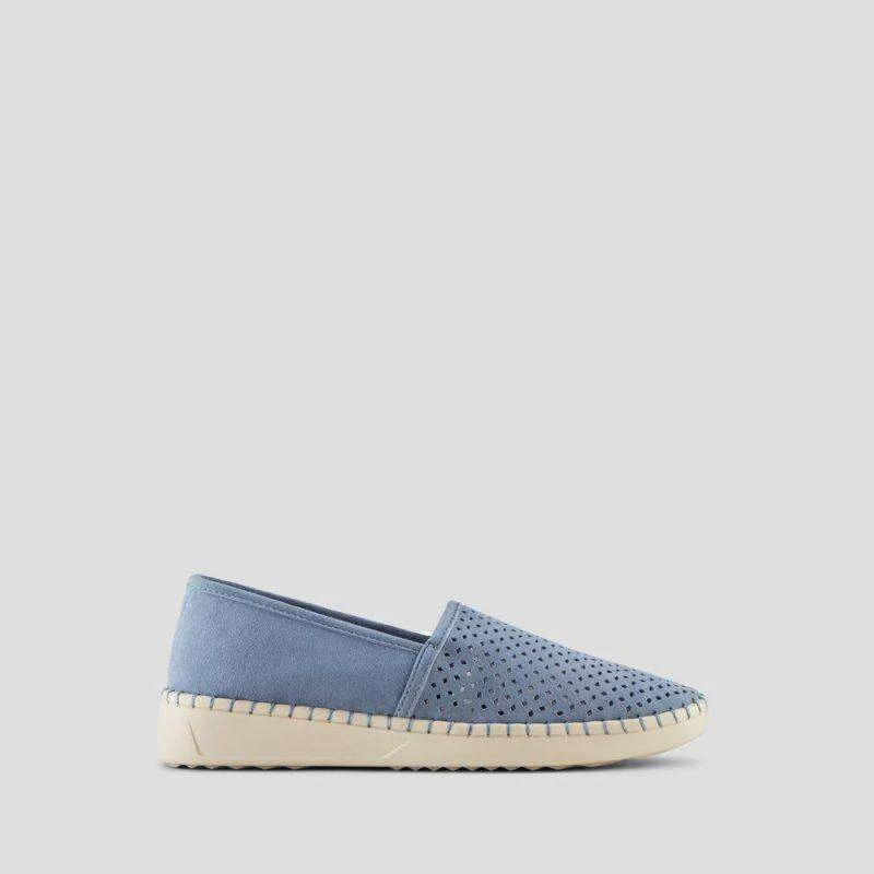 Luxuriously soft perforated kid suede leather espadrille style slip-on. Removable molded foam leather insole. Tonal welt hand stitching. Flexible, lightweight anti-slip outsole.