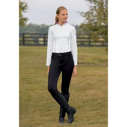 Devon-Aire’s Power fleece breeches keep you warm in sub freezing temperatures while allowing you the freedom of movement to ride comfortably in the saddle. Featuring Devon-Aire’s 4 way stretch Power Fleece fabric; the Pro 300 Stretch fabric, has a water repellent and anti-pilling finish. Smooth outside face repels dirt and water and keeps shavings from sticking to your leg. Soft plush velour inside keeps you warm and comfy with top notch thermal properties. These breeches are patterned after traditional full seat breeches with plush elastic waistband, heavy duty front zip and top quality brass front snap closure. reinforced belt loops and adjustable hook and loop ankle closures. They are contoured for a flattering fit and eliminates bagging behind the knee. Not bulky!!! You will be tempted to wear them everywhere!! Import.