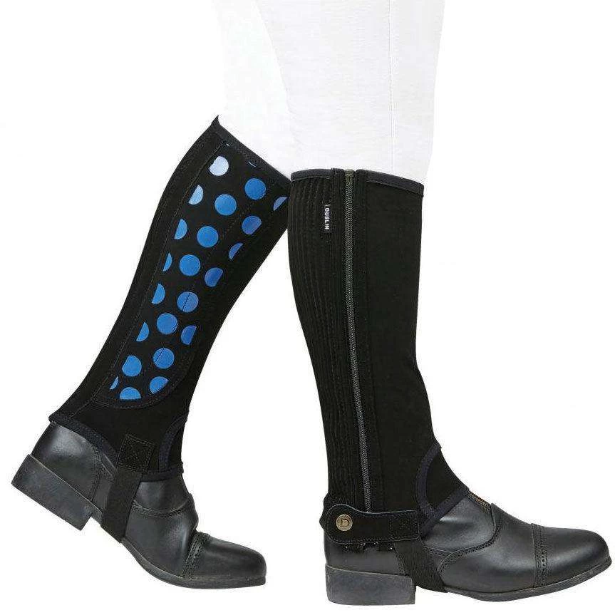 Dublin Childs Easy Care Half Chaps Made Of Synthetic Suede for Lasting Durability. Features a Ribbed Elastic Calf for Expandable Comfort. YKK Side Zip Entry With Bottom Snap Over Closure. Features: Easy-Care, Durable, Machine-Washable Synthetic Suede Secure top to Bottom Closure, Elastic Calf to Ensure a Terrific Fit and Extra Comfort Full Length YKK Side Zipper With Snap Closure.