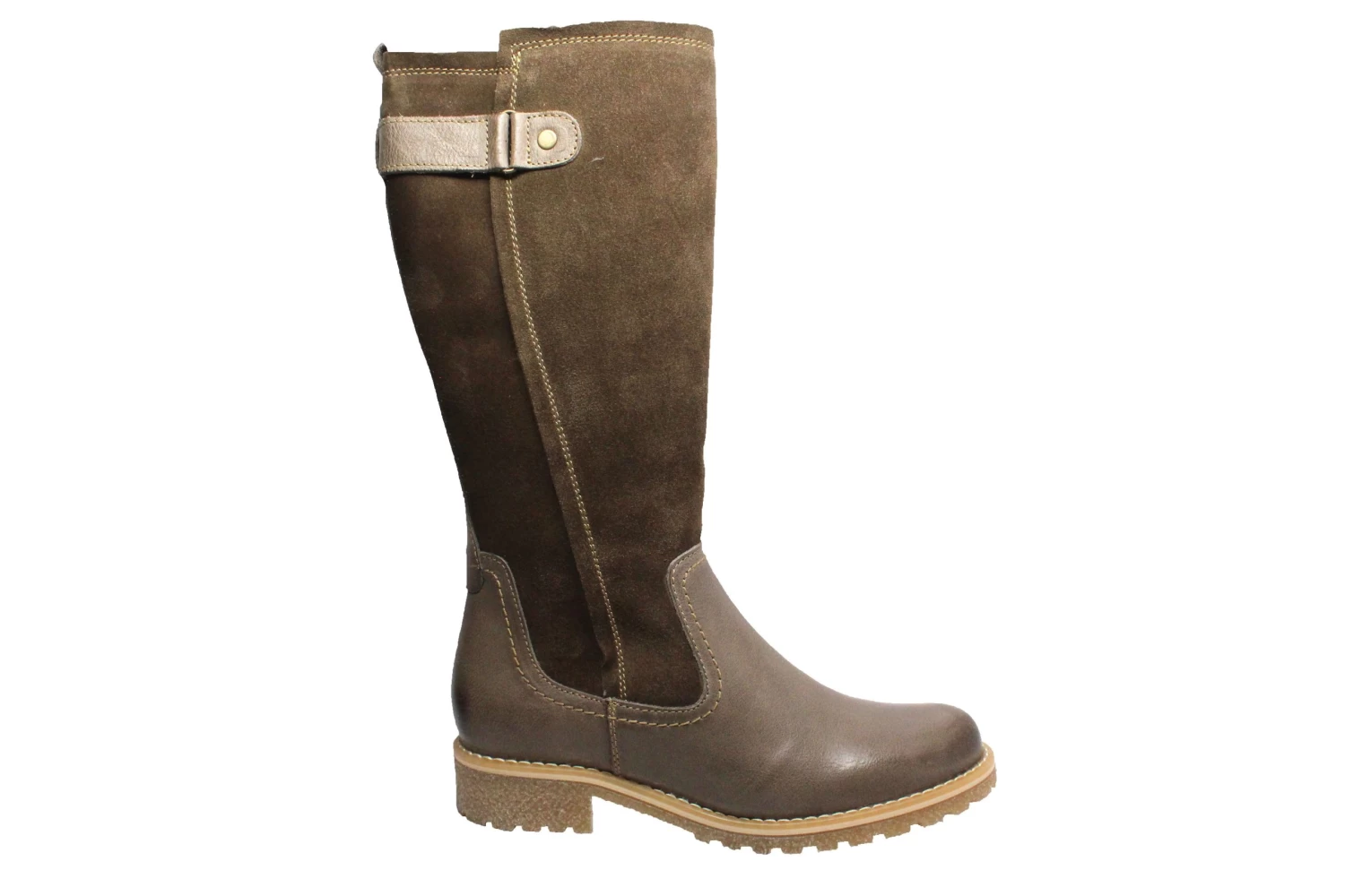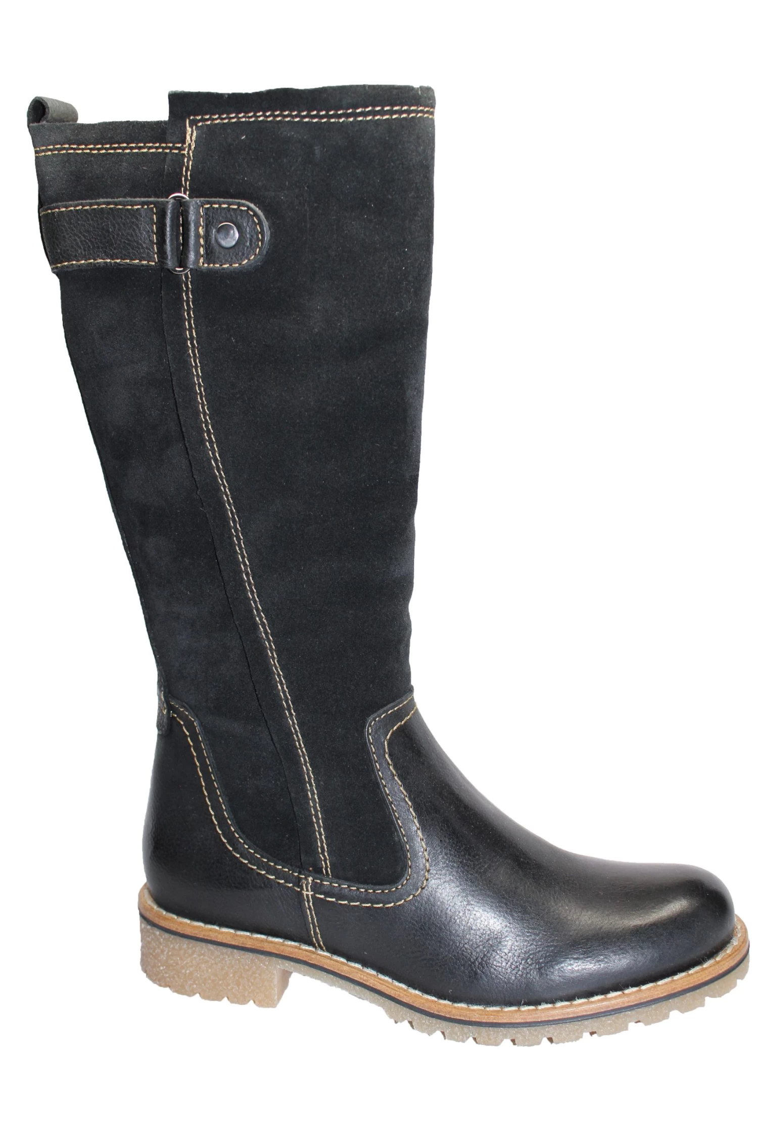 Our warm, water-resistant Marcella boot combines riding-boot elegance with a tread built for walking. Details like contrast stitching and a decorative strap around calf make this leather-and-suede boot the perfect complement to your coziest winter looks. Heel height 1 1/2 inches, shaft height 13 inches.