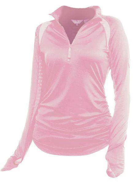 Super lightweight, silky, technical fabric in a fun sporty long sleeve sun stopper shirt. This shirt will take you on any activity from running to bike riding or horseback. Streamlined silhouette with rusching at sideseam waist for a flattering and comfortable fit. Thin poly/spandex mesh under sleeve, raglan and back center back for extra breathability and coolness. Mock neck with sporty chunky zipper and a rubber logo pull. Rubber logo on sleeve finishes this very versatile shirt.