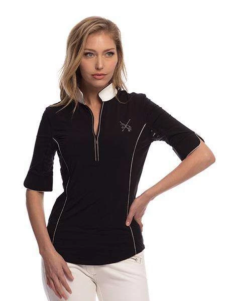 This beautiful new show shirt is a for sure favorite. Stunning streamlined, fitted silhouette with piping details on princess panels, cuff and collar. Comfortable moisture wicking knit fabric with striped poly/spandex mesh under sleeve and back neck for extra breathability and coolness. Slightly longer sleeve with a cuff that can be worn down or flipped up for a shorter look. Mock neck with hidden reflective zipper and pretty crystal embroidery at chest finishes this modern show shirt. A show stopper for sure!