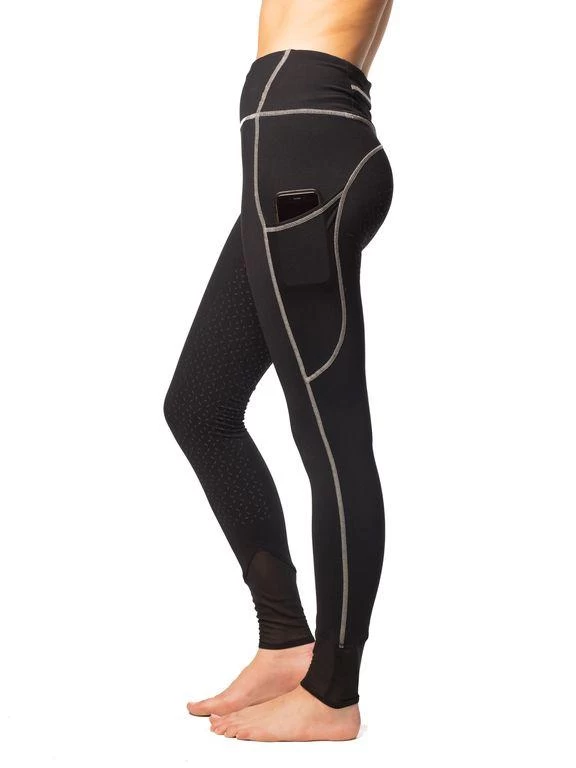 Sensil Innergy fiber, Nylon/Spandex, super stretch with silicone full seat gripper dots. Anti-cellulite, energizing, body sculpting, moisture wicking.  This breech takes you from the saddle to the yoga studio, to biking or running. Compression fabric with a tummy control waistband. Beautifully placed for a stunning flattering fit.  Back and side pockets to stash your phone and belongings. With silicone on the full seat for the absolute best grip. This is the latest and greatest in innovation and technology, you won’t take them off.