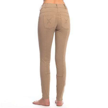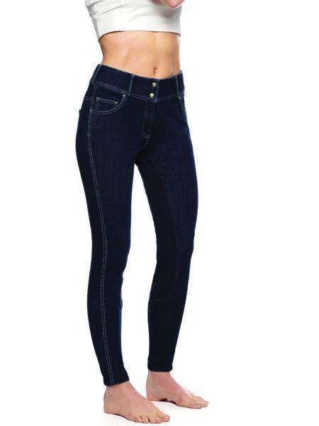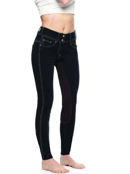 One of the most flattering of full seat riding breeches. The Vogue Jean Full Seat Breech is a new composition of specially twisted yarns for super stretch and soft velvet touch. An incredibly flattering riding breech in a mid-rise fit. Subtle whips embroidery on back pockets and whips embossed on hardware. A custom fit stretch waistband adds to ultimate comfort in the saddle.