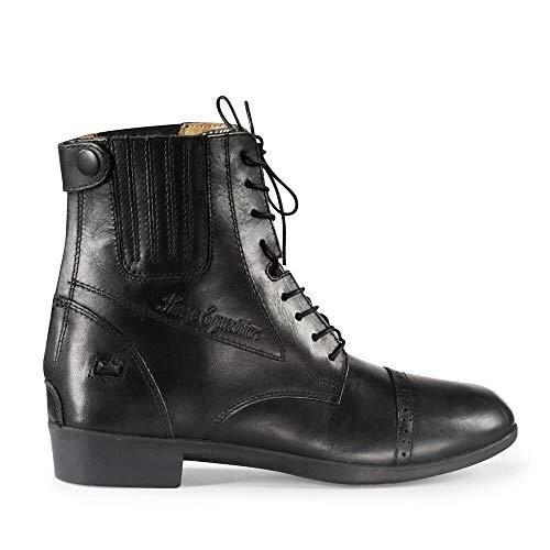 Horze Hamptons Paddock Boots Choose these leather paddock boots with laces in the front and zipper behind for a traditional look combined with convenience. The soft and comfortable sole is sturdy and supportive. Elastic at the top of the boot adds style and stretch. The Horze Equestrian name is embossed on the side to match any collection. Features: Classic lace-up paddock boot style Washing Instructions: Wipe with a clean damp sponge after each use to remove sweat and dirt. Dry with a soft, clean towel. Polish w/leather care product as directed.