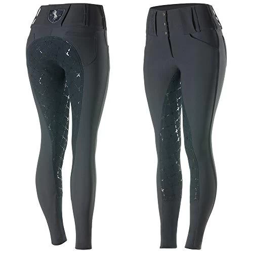 The Horze Women’s Desiree Full Seat Breeches are stunning riding pants designed with a vertically stretchable Alos leather full seat that includes a cool silicone pattern for style and functionality helping you to stick like glue to the saddle. The breathable fabric retains its shape while repelling dirt and water so you always look your best. The extra high waist with wide belt loops is a favorite among dressage riders and will support you while holding your in your stomach. The flattering Desiree breeches include UV protection (UPF 50+). Further features are front and back pockets, wide belt loops, a front zipper, as well as a stylish back logo. Get these great breeches today and be a trend-setter in your barn! Eros fabric: 93% Polyamide, 7% Elastane.