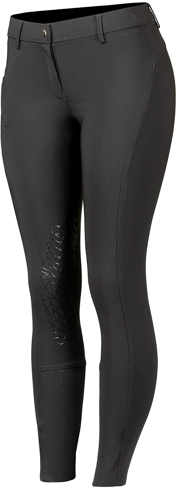 The great fitting on these breeches are perfect for all sizes. The four-way stretchable fabric is breathable and moisture wicking and offers a medium waist for optimal comfort. A silicone printed knee patch in a fresh pattern gives great grip in saddle so you can perform at your best. The Swarovski crystal detail add bling to your everyday riding.