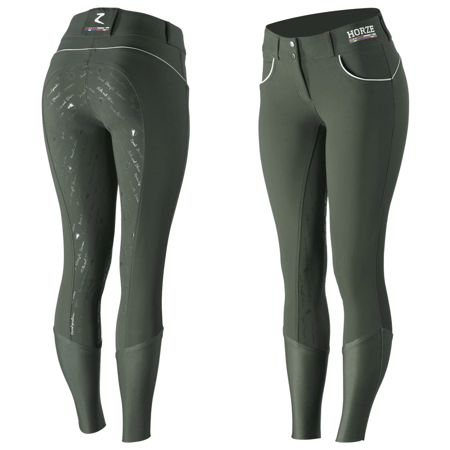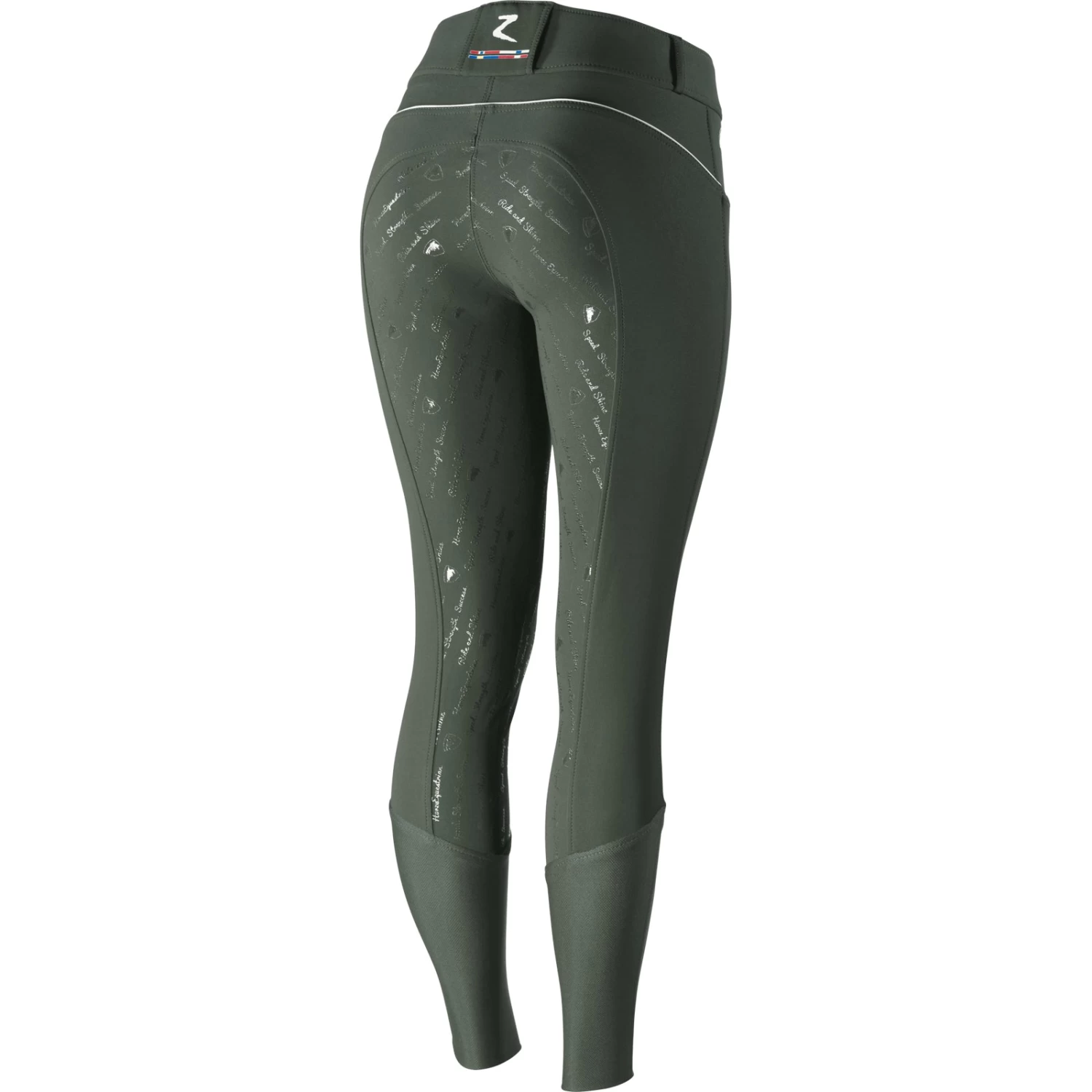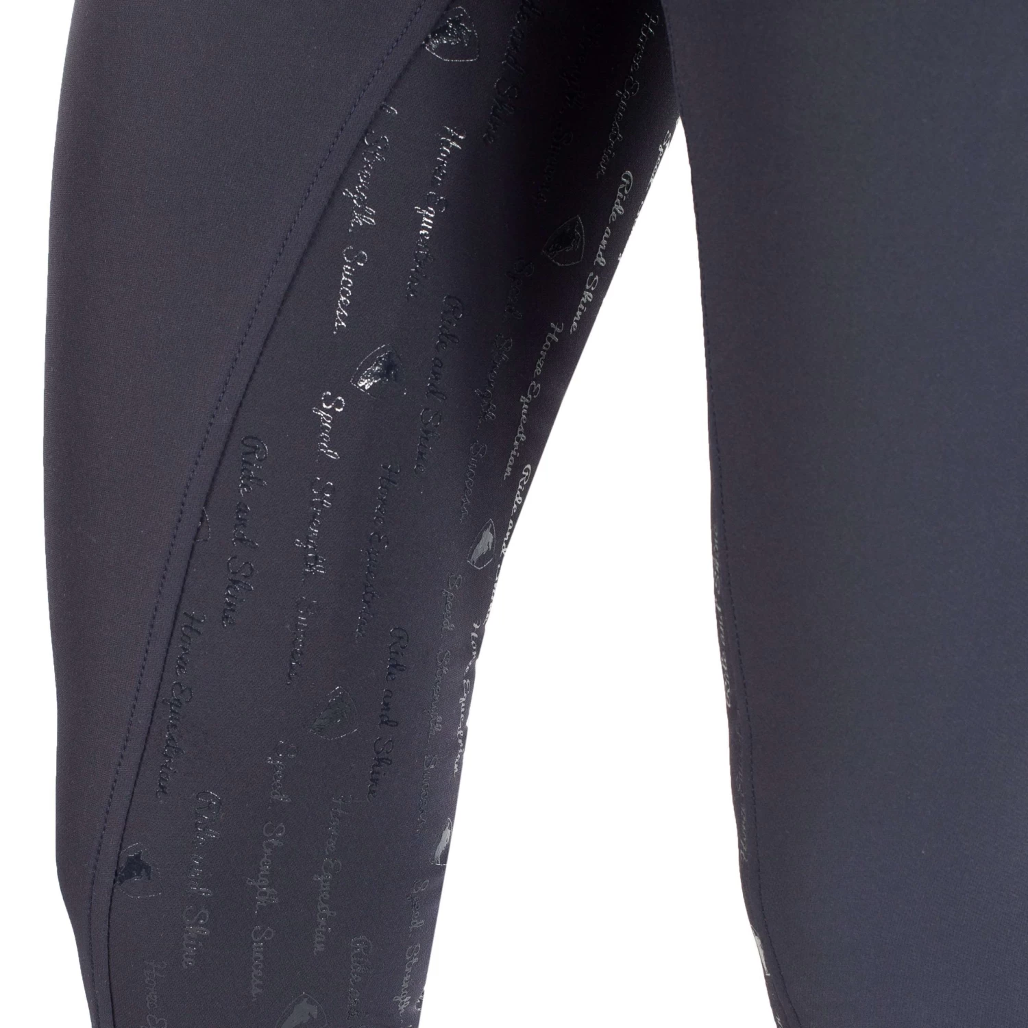 Features phrases like “Speed, Strength, Success” and “Ride and Shine” interspersed with the Horze jumper logo and the “Horze Equestrian” branding, these breeches are more than a pair of riding pants, they will lift up your spirits as you climb up into the saddle. This lightweight yet durable breeches only get more comfortable and fit even better after each wash and wear as they will conform to your body. The silicone full seat won’t make you overheat and is as comfortable while you are on the ground as you are in the saddle. With just enough of a sticky grip, these breeches are perfect for schooling and training. Grab a pair of these sporty breeches in every color to make your training days fun and fashionable. The Women’s Nordic Performance Full Seat Breeches, by Horze, fit like a glove and are so comfortable, that you’ll forget you’re wearing them long after you’ve left the barn. In addition, the fabric is UV-protected (UPF 50+). Full seat breeches offer added grip for dressage. The full seat includes silicone to help you sit the extended trot and adds security and aids with balance and stability. Machine wash inside out in warm water. Line dry. Do not iron. Do not use fabric softener.