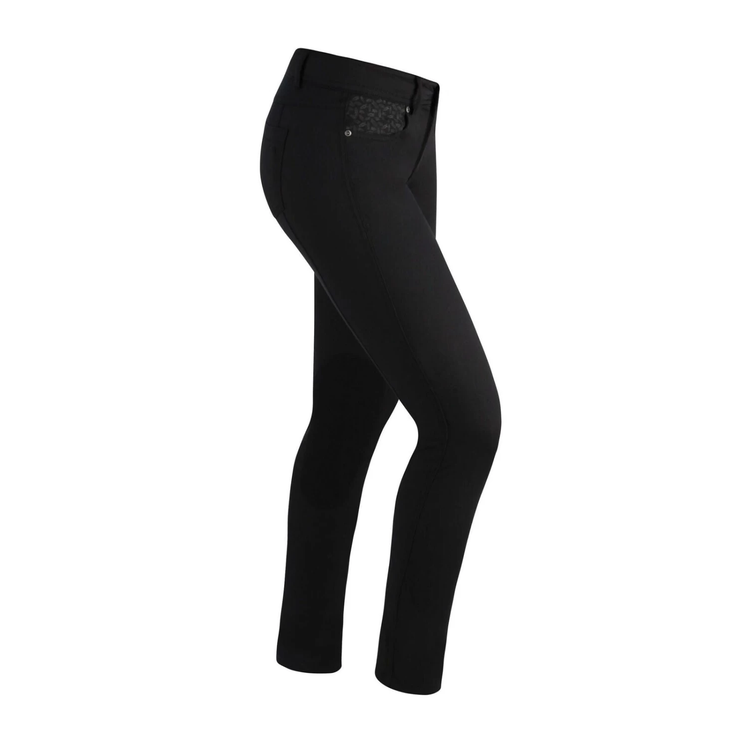The Irideon Ladies Pembrook Knee Patch Breeches are a classic 5-pocket style breech enhanced with horse head repeat pattern inside two front pockets, adding a touch of flair to a traditional favorite. A 2 waistband provides comfort and support while keeping the breech position flatternig and secure. Material-56% Cotton, 37% Polyester, 7% Spandex