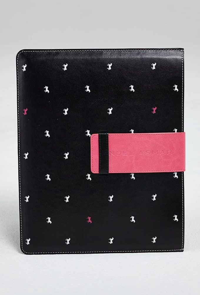 Show your personal style with our new faux leather polk-a-dot Pony tablet sleeve. Fits most tablets. Black faux leather White with splash of pink pony pattern. Pocket style case fits all iPads and most tablets Finished size measures 21.25cm x 26.5cm.