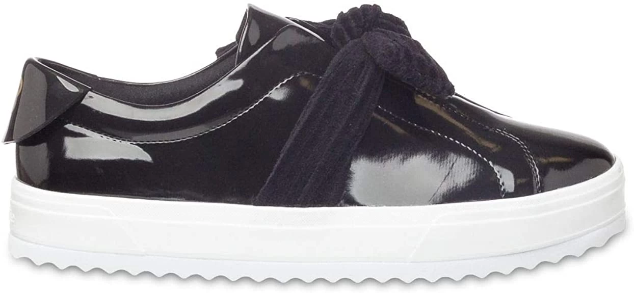 Made of synthetic with varnish texture and flat type sole. No lace, but with plush fabric detail in the central part of the product to make it look more beautiful.