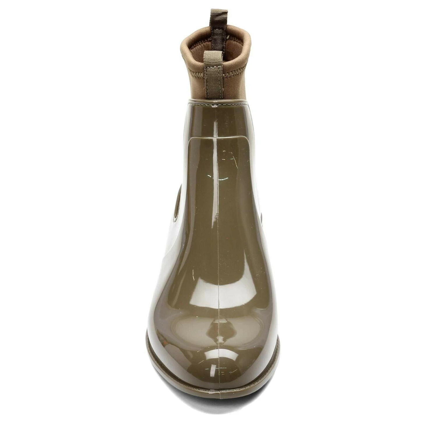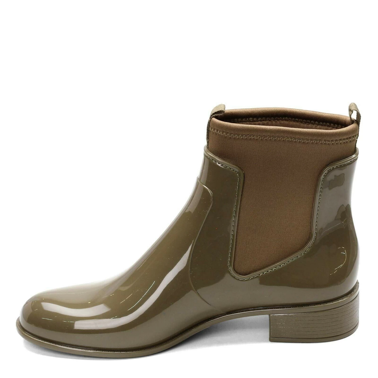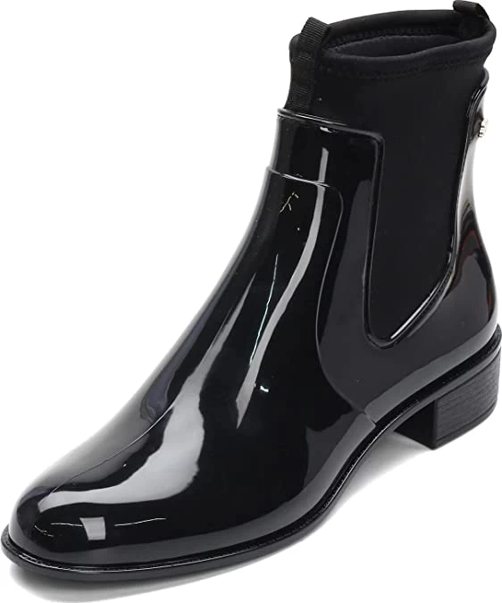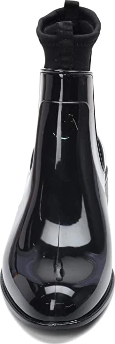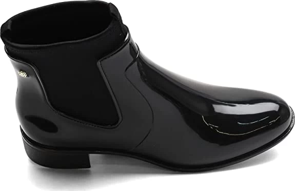 Show off your sense of style even in cold or wet conditions in this slip on ankle boot. The stretch fabric inner lining makes these boots super comfortable to wear. Stretch fabric and synthetic shiny J-Lastic upper – an exclusive PVC material with a fun perfume scent. Slip on styling for easy on and off. Super lightweight synthetic sole design. Stacked look block heel. Heel Height of 1.00 inches.