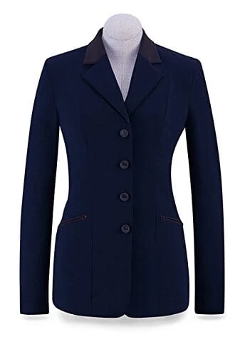 This solid navy coat with brown collar and pocket detailing is showcased in the new Victory model. This model features 4 front buttons, sleeve buttons, double zipper pockets and a double vented back. The hidden interior zipper eliminates gapping. The fabric used in this colorway is a doublefaced fabric which offers a little more weight and structure to the garment. The fabrics boast high end features including: ultimate stretch, moisture control, machine washability, wrinkle free wear for seamless travel, UV protection equivalent to SPF 50 sunscreen, and Eco-friendly fabric construction. The unconstructed design allows for maximum freedom of movement by eliminating shoulder pads and lining. The impeccably tailored garments with more fitted and shorter silhouettes allow riders to look and feel at the top of their game.