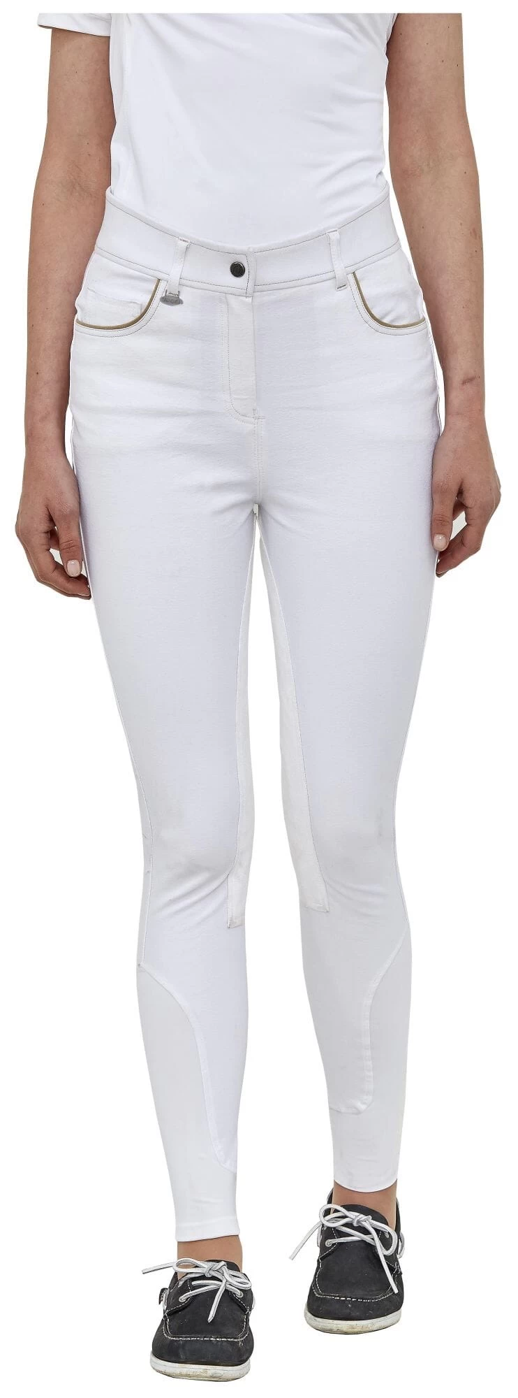The Shelton ladies smart breeches are designed for competing in with shaped high waist back panel, stretch simulated leather knee patch and contrast colour trim at pockets and contrast colour topstitching. Stretch panels at the ankle provide a comfortable fit under your boots or chaps.