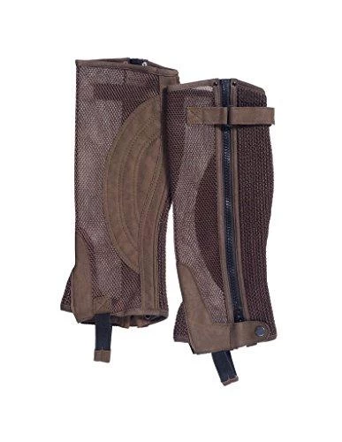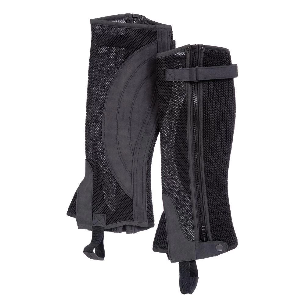Pre-shaped design allows these half chaps to mold around the natural contour of the lower leg for a super close comfortable fit. Breathable mesh calf with synthetic suede over top of foot and inside of calf for grip. Full length zipper and snap closure at bottom.