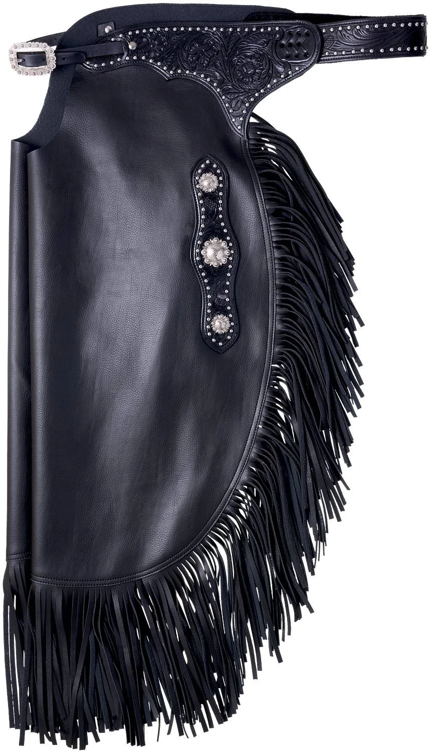 These faux leather chinks feature floral tooled yoke with dot accents and fringe down the length of each leg. Floral and dot design with three conchos adorn the side of each leg. Black pair features silver conchos and buckles and brown pair features copper conchos and buckles. Three buckle closure attachment on each thigh. Back of yoke is adjustable with leather lacing and front is adjustable with buckle.