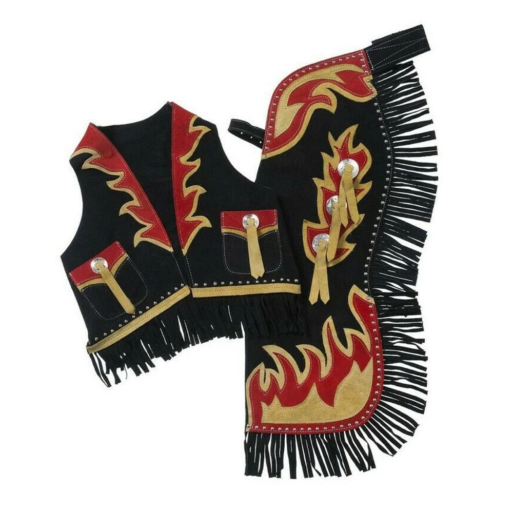 A must-have for every little buckaroo! Genuine split leather chap and vest set with buckle front belt and adjustable rear belt. Features bucking horse design with leather flame accents and silver conchos.