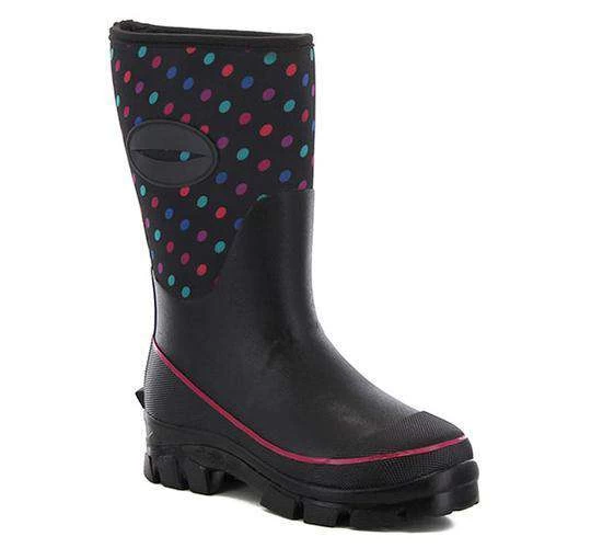 Jewel toned polka-dot printed neoprene winter snow boots. Waterproof and insulated to keep feet warm in negative 40 degree weather! Hearty traction rubber outsole while the inside is lined with warm and soft faux fur.